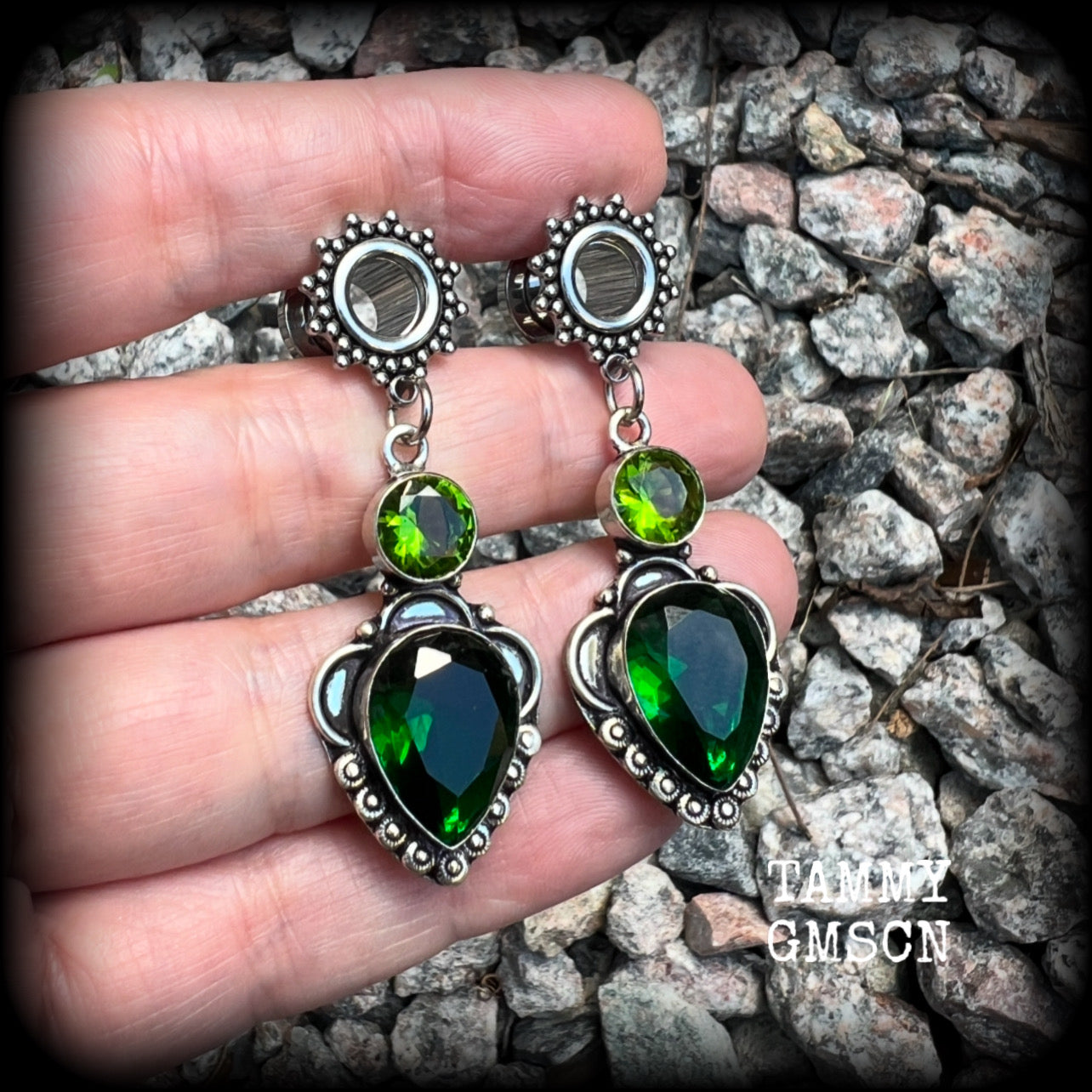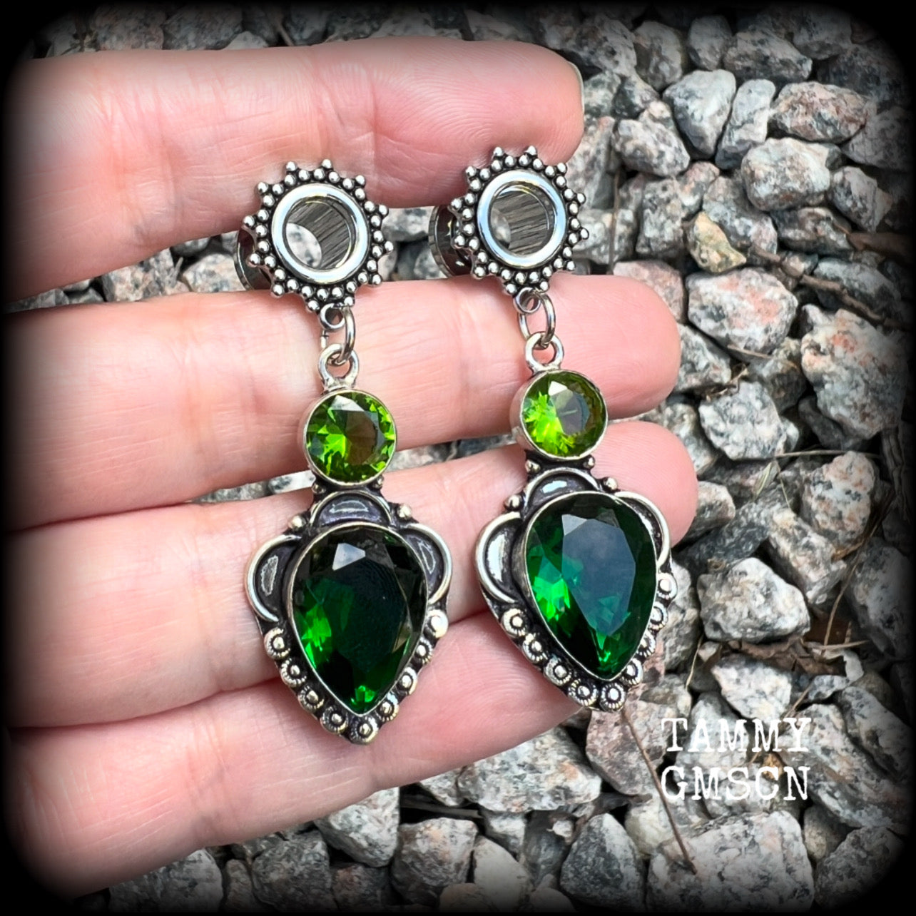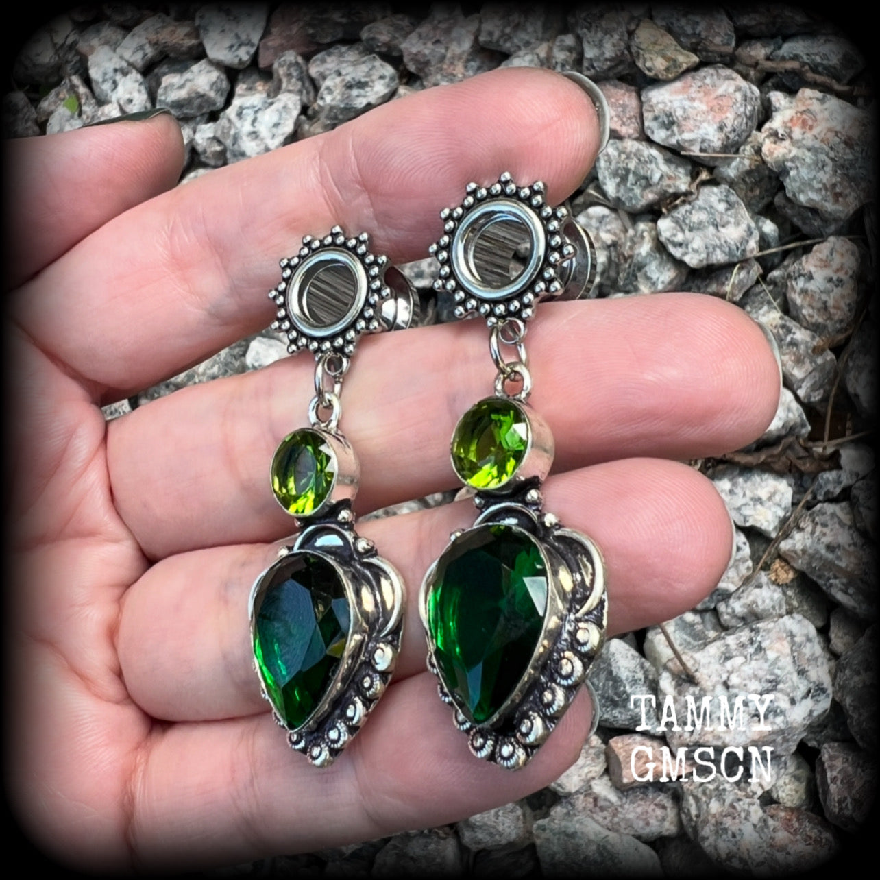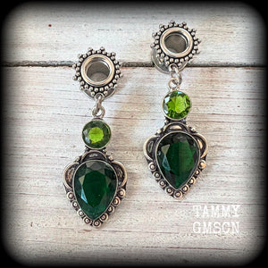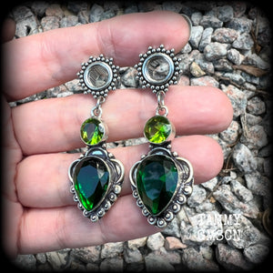 These beautiful tunnel earrings have been made with gorgeous green quartz and beautiful green peridot facet gemstones in a boho antique silver setting, weighing approx 8 grams each and measuring just on 5.5cms from tip to tip.